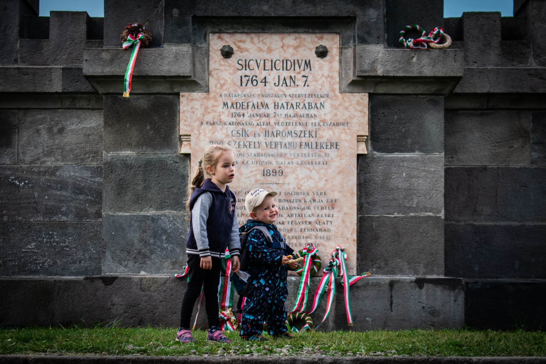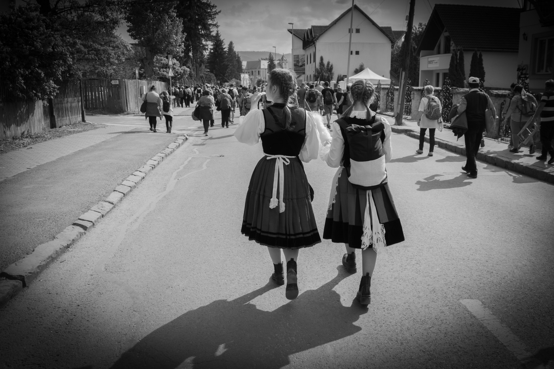 Csíksomlyói kislányok a kapujukba kiállva nézik a nyeregbe vonuló tömeget